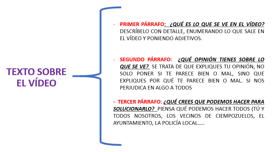 Tienes que ver un breve vídeo y escribir un texto en tu cuaderno. El texto tiene que tener 3 párrafos separados por un punto y aparte. En cada párrafo tienes que escribir una cosa distinta y tiene que tener POR LO MENOS 10 FRASES EN TOTAL.